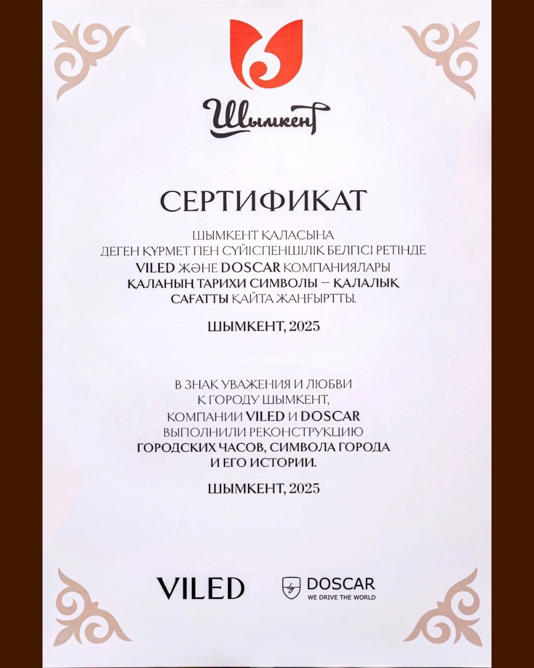 28 июня компания DOSCAR совместно с VILED официально завершили реконструкцию городских часов на площади перед железнодорожным вокзалом в Шымкенте и вручили акиму города сертификат в знак уважения и любви к родному городу.